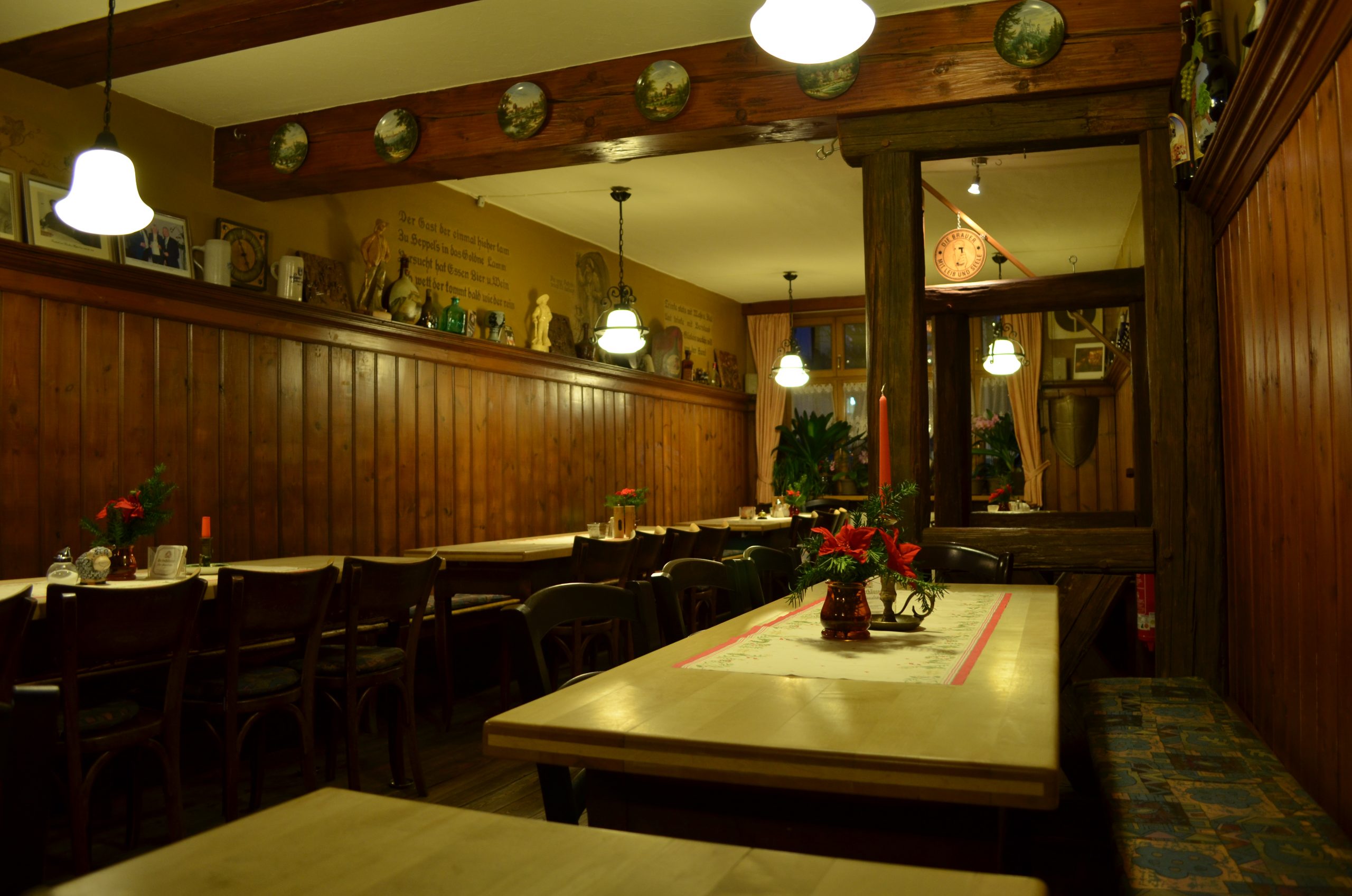 Wir sind stolz darauf, sie in unsere historische Gaststube mit ihrem gemütlichen Ambiente einladen zu können. Gut 50 Personen können hier Platz nehmen. An den massiven, rustikalen Holztischen können Sie entspannt zusammen sitzen. Schon seit hunderten von Jahren verbringen Menschen gemeinsame Stunden in diesen Mauern, wovon auch die historischen Trinksprüche an der Wand zeugen.